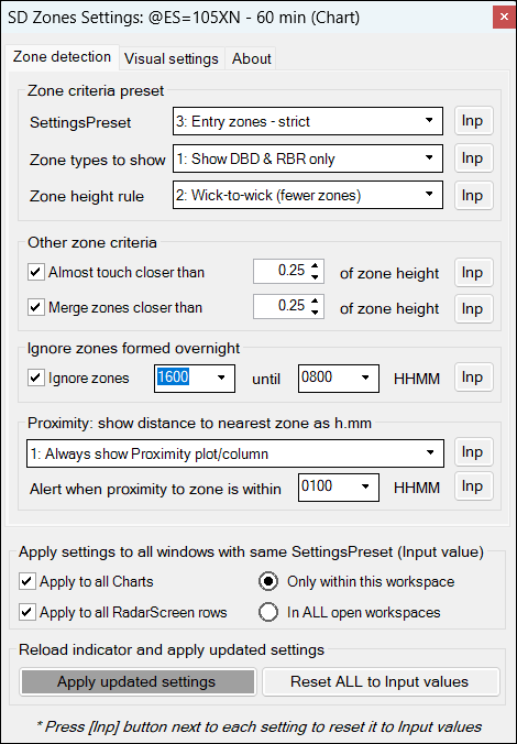 - Settings can be changed with traditional TradeStation Inputs as well as with an easy-to-use Settings panel (see screenshot), which allows changes to be applied to ALL charts and RadarScreen rows with a single mouse click.