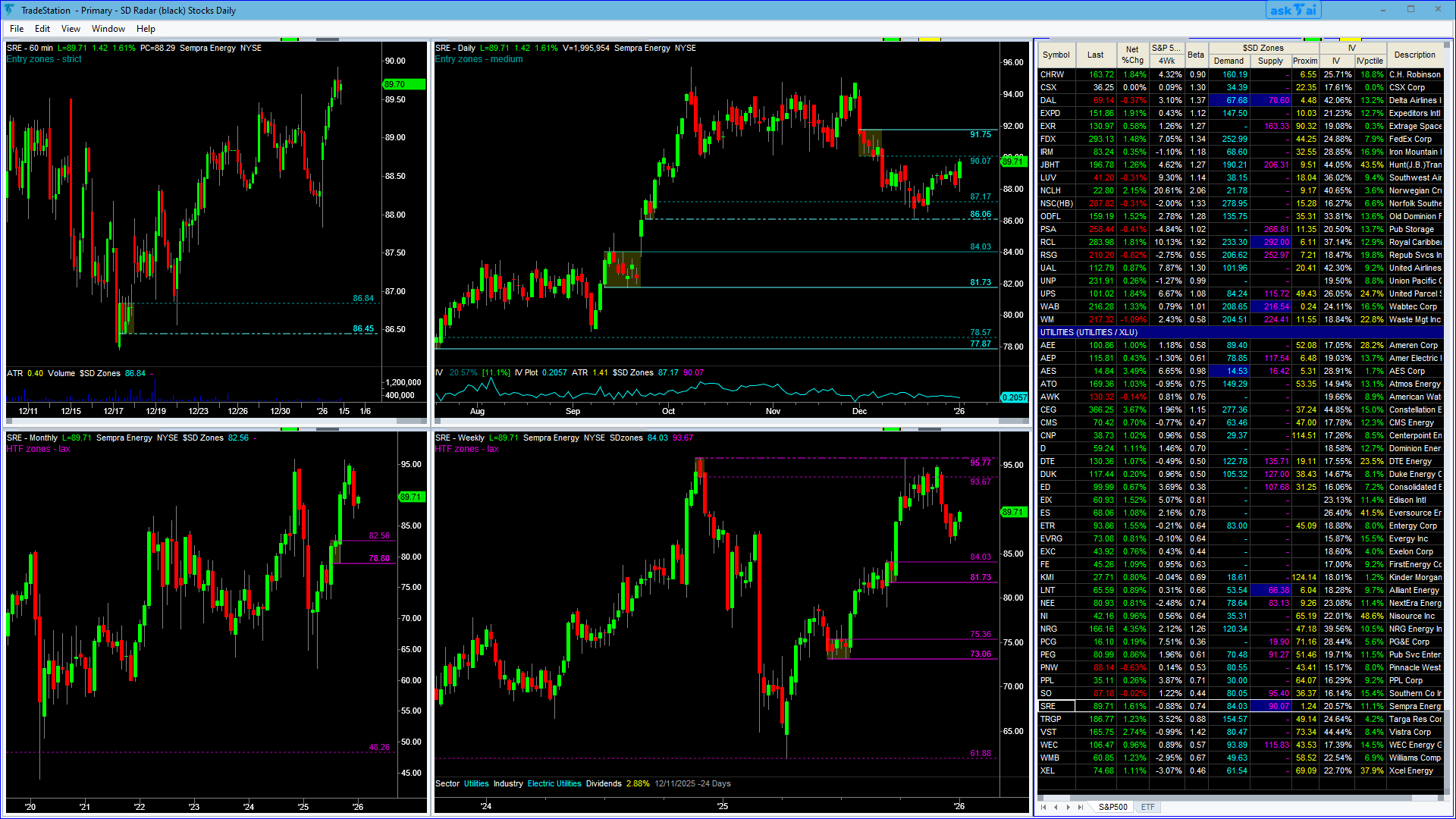 The SD Radar Stocks workspace scans the entire list of S&P 500 stocks and 80 ETFs. The RadarScreen (right) highlights stocks near quality zones and lets you quickly pass on stocks that do not have the desired qualities and go to the next candidate without even looking at charts. The Entry charts (top row) show the zone found in RadarScreen and an X-ray view to verify zone structure. The High Timeframe charts (bottom row) are used to determine preferred trade direction (trend) and room to go (profit potential). The workspace also shows Sector and Industry for proper correlation, IV, IV Percentile and Historical IV to evaluate options premium, and upcoming Dividends to avoid premature assignment and other gotchas.