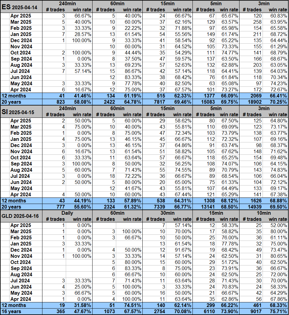 - 71.56% of 145,368 zones across 7 different ETFs on 10, 15, 30, 60 minute and Daily intervals over 20 years to April 2025.